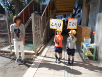 毎日 運動会 2017年10月26日 15時00分 運動会は終わりましたが、子どもたちにとっての運動会ごっこは毎日続きます。行進したい子はプラカード応援したい子はポンポン4歳児 プラカード係の行進です。1、2、1、2 ・・。いろいろなところを歩いていきます。こちらは4歳児の応援団です。5歳児が先生になって教えてくれています。がんばれーがんばれー オー!4歳は、あこがれの気持ちをもって仕事を教えてもらっています。園庭のあちらこちらで運動会ごっこが開催中です。